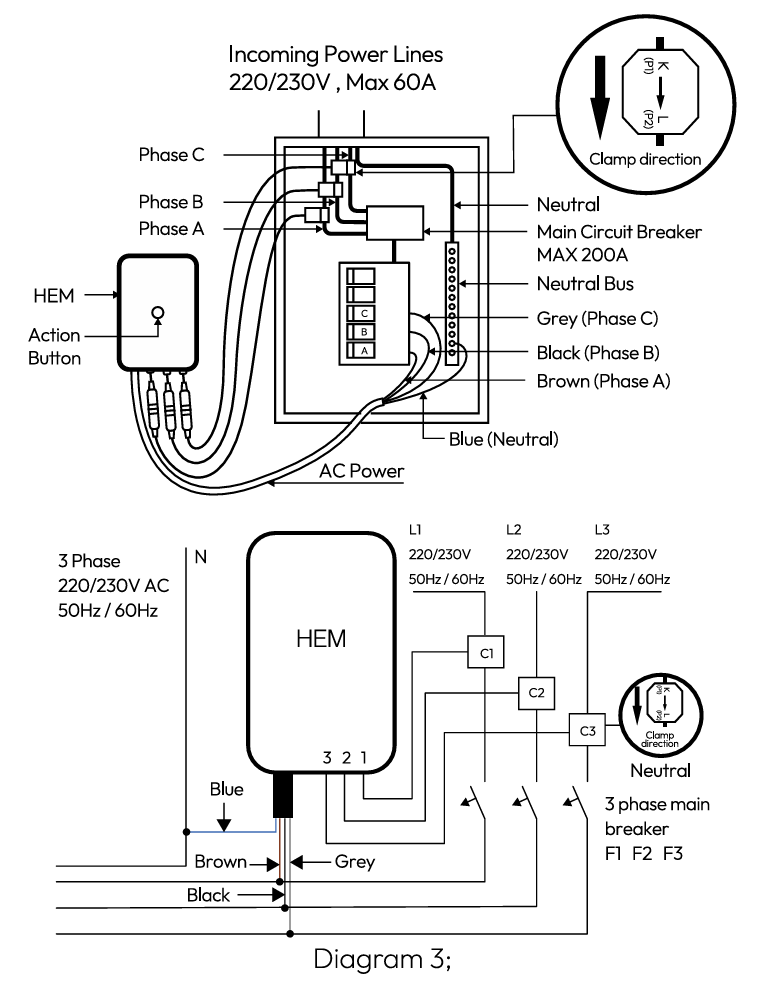 To perform the electrical installation for your Home Energy Meter (HEM), utilize the previous images to determine the phase version of the HEM and to also illustrate the following steps 3 through 7.