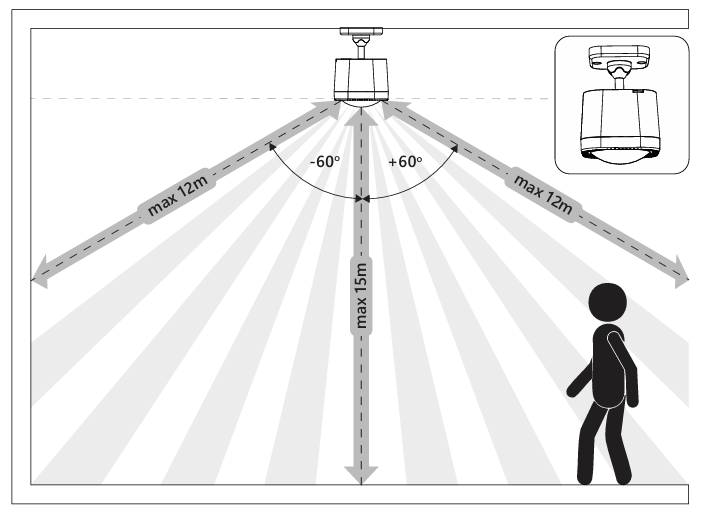 There are some placement considerations when using the Multisensor 8 as a motion sensor. Above are some diagrams that show the distance at which the wall or ceiling installations can perform based on the height they are installed at and at the angle.